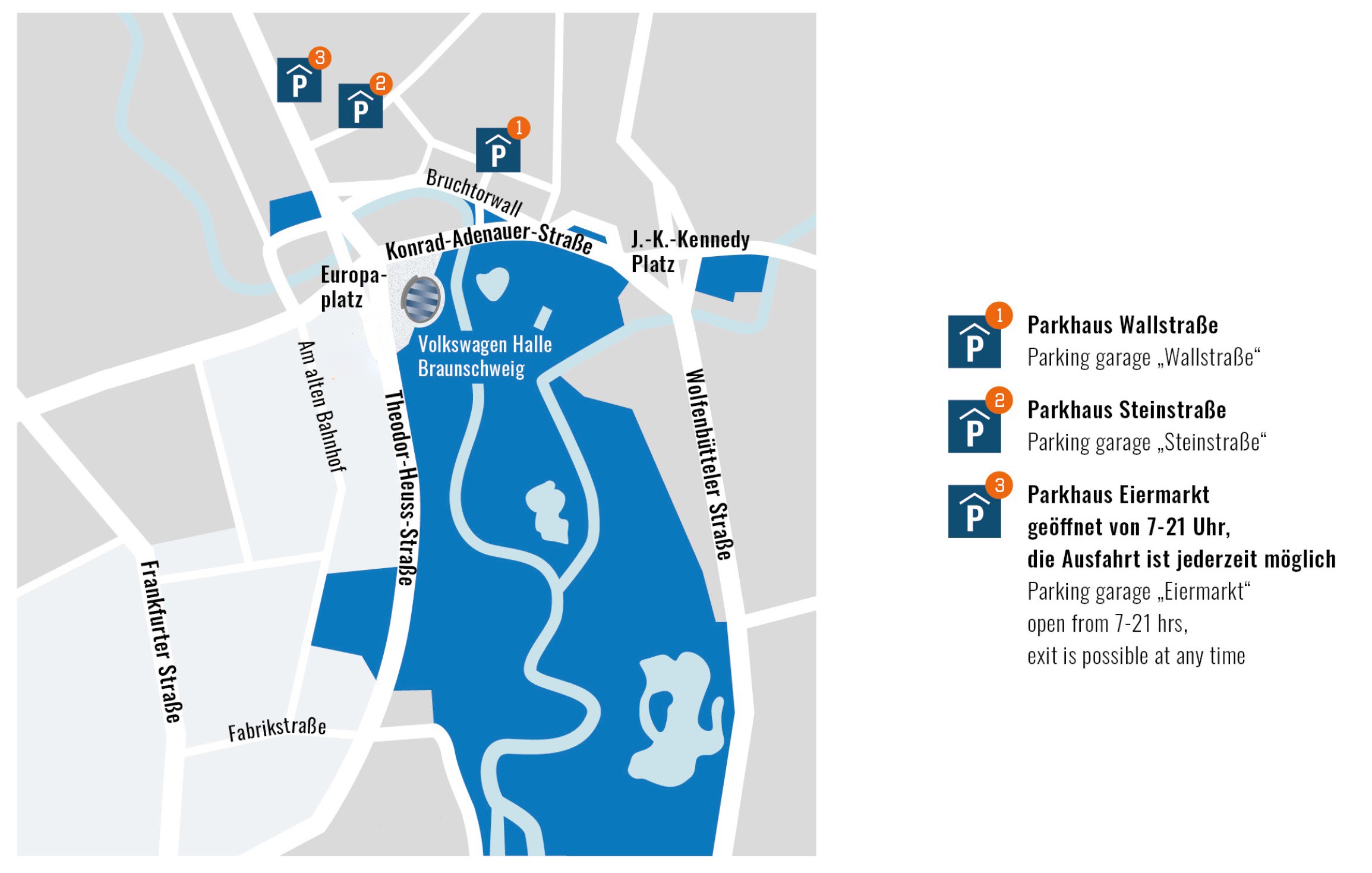 Für Ihre bequeme Anreise zur Volkswagen Halle Braunschweig stehen Ihnen in unmittelbarer Nähe mehrere öffentliche Parkhäuser zur Verfügung.