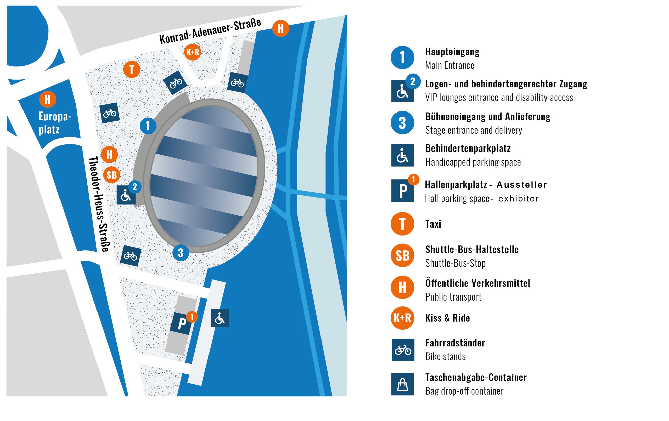 Öffentliche Verkehrsmittel (H) & Shuttle-Bus (SB): Die Haltestellen für öffentliche Verkehrsmittel und unseren Shuttle-Bus-Service befinden sich zentral am Europaplatz und sind nur wenige Schritte vom Haupteingang entfernt.